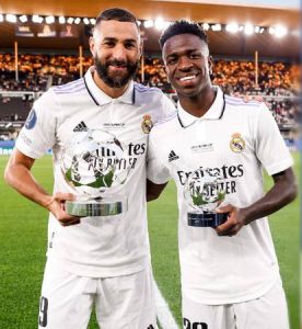 Kevin Ribeiro (@kevinribeiro1999) – Pasión X el Deporte.- Minutos antes de que iniciará la Supercopa de Europa, la UEFA aprovechó para reconocer el gran nivel del francés Karim Benzema y del brasileño Vinicius Jr. en la pasada edición de la Champions League.