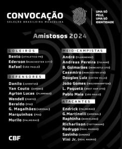 Delanteros: Endrick (Palmeiras), Gabriel Martinelli (Arsenal), Raphinha (Barcelona), Richarlison (Tottenham), Rodrygo (Real Madrid), Savinho (Girona) y Vinicius Jr. (Real Madrid).
