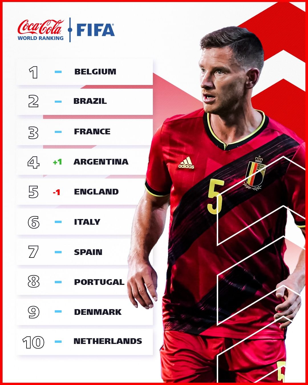 La selección de Bélgica se mantiene como líder de la clasificación por delante de Brasil y Francia, mientras que Argentina le arrebató el cuarto puesto a Inglaterra, la ‘Albiceleste’ subió de puesto gracias a su buen desempeño en los partidos de las eliminatorias sudamericanas. El top 10 lo completan Italia, España, Portugal, Dinamarca y Países Bajos.