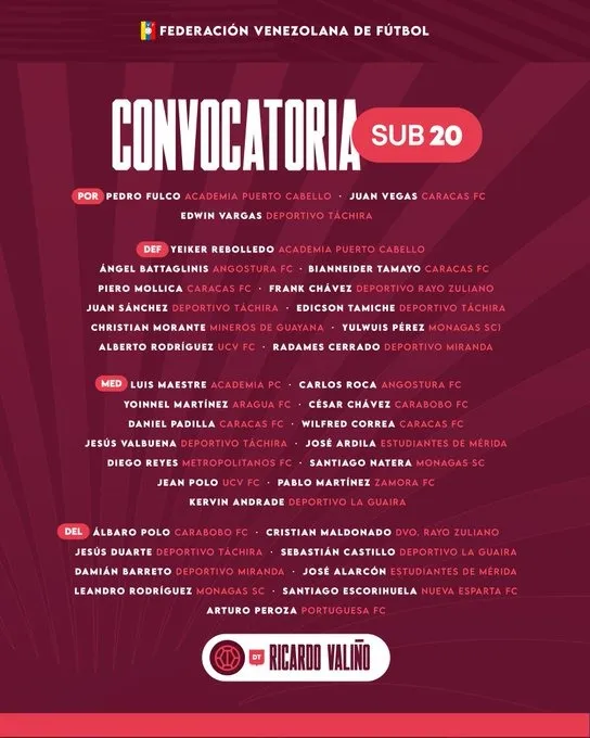 Cabe destacar que el cuerpo técnico de la Vinotinto Sub-20 trabajará con los futbolistas convocados a partir del 25 de abril.